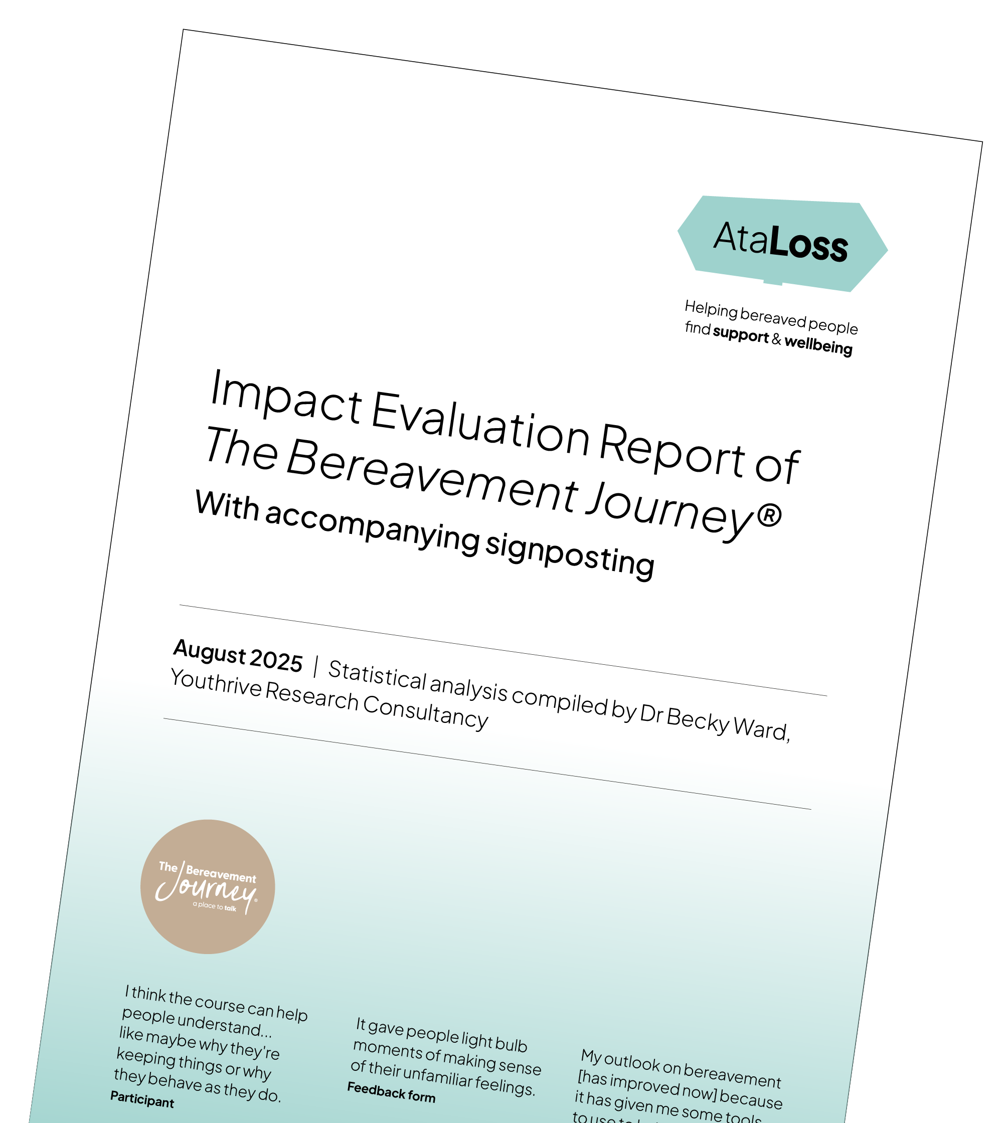 A new evaluation shows how The Bereavement Journey®, developed by AtaLoss and delivered in communities across the UK, alongside signposting, is helping thousands of people face life after bereavement – improving wellbeing, reducing loneliness and building resilience. Read the report. Read the Evidence Base.